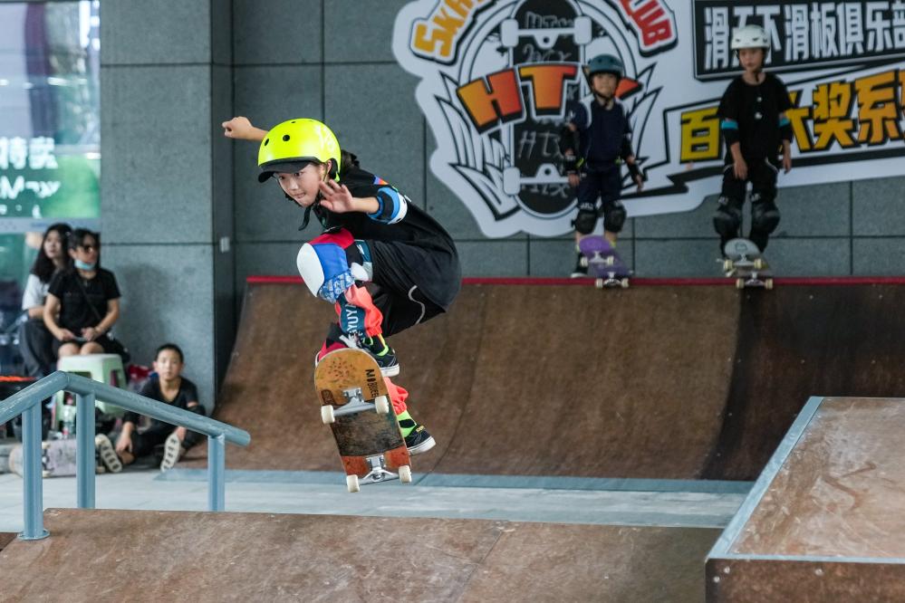 一名滑板爱好者在南京市建邺区一处滑板俱乐部进行趣味滑板比赛。新华社记者 李博 摄