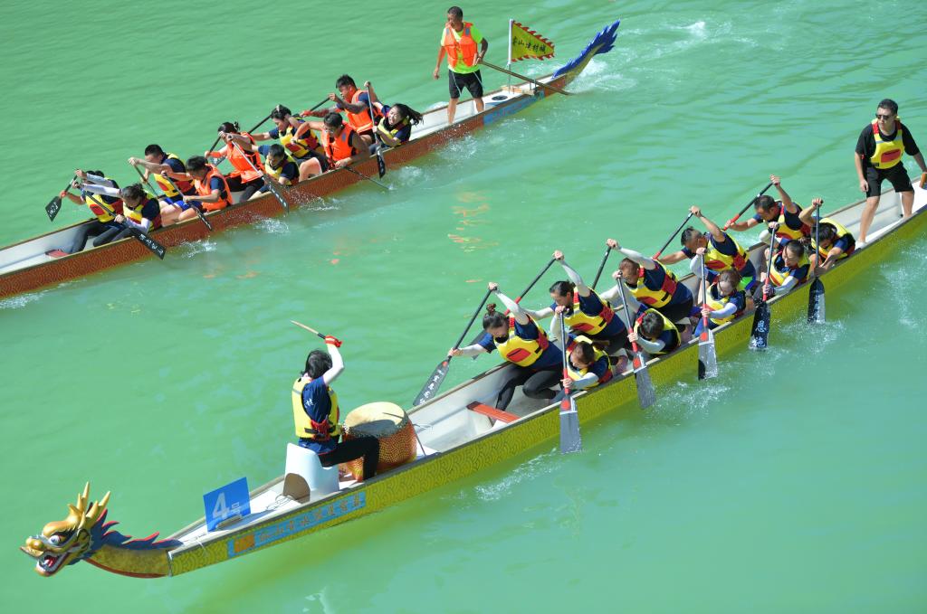 选手在湖北省宣恩县仙山贡水旅游区的贡水河上参加划龙舟比赛。新华社发(宋文 摄)