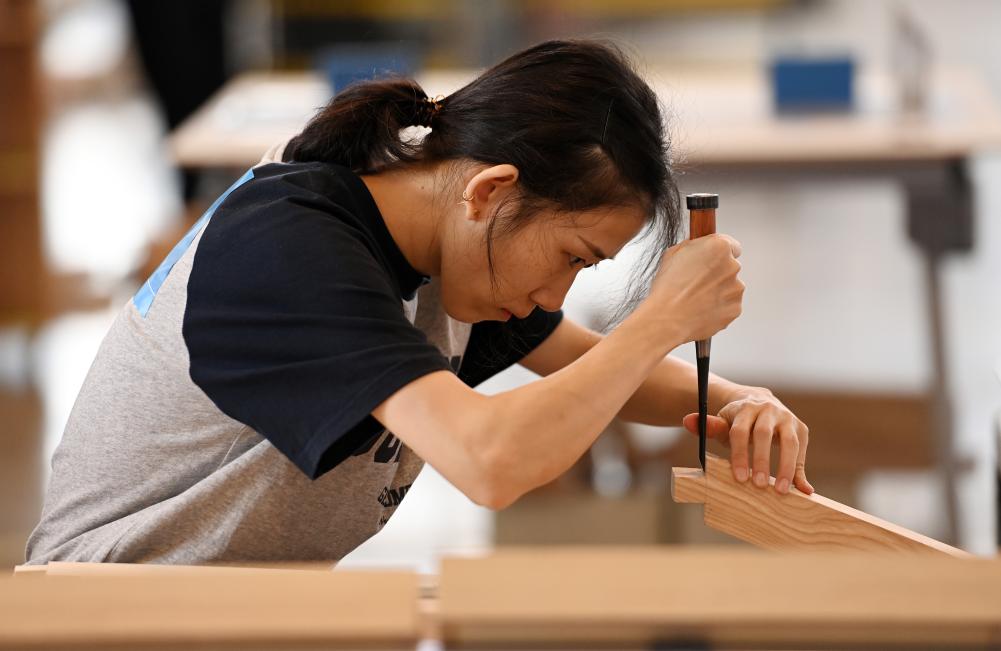9月17日,参赛选手在参加木工项目比赛。新华社记者赵子硕 摄