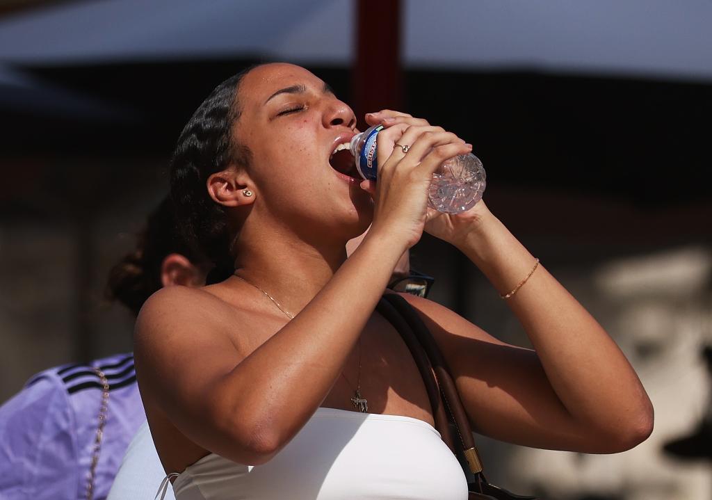 7月19日,在法国南部城市蒙彼利埃的喜剧广场,一名女子边走边饮水。新华社记者 高静 摄