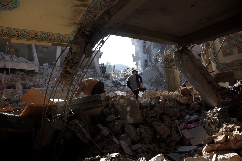2022年1月18日,在也门首都萨那,人们查看空袭过后的废墟。新华社发(穆罕默德摄)