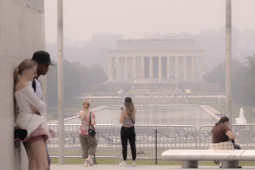 6月29日,在美国首都华盛顿,游客在华盛顿纪念碑游览,远处的林肯纪念堂笼罩在烟雾中。据加气象部门监测,6月上旬野火产生的烟雾一度覆盖北美大陆从中部一直到大西洋沿岸的大片区域,渥太华、多伦多、蒙特利尔等都市区,乃至美国纽约、芝加哥等城市的空气质量都急剧恶化。新华社发(亚伦摄)