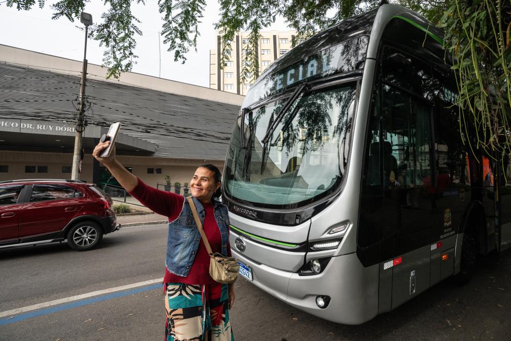 7月12日,在巴西圣保罗州圣若泽杜斯坎普斯,游客与比亚迪纯电动大巴合影。(新华社记者王天聪摄)