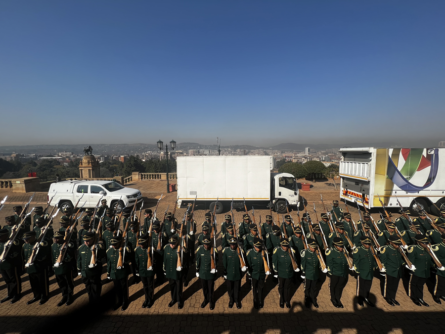 在总统摩托车队护卫下,习近平主席乘车抵达总统府,拉马福萨总统在下车处热情迎接。两国元首登上检阅台。仪仗队行持枪礼,军乐队奏中南两国国歌,现场鸣放21响礼炮。习近平主席检阅南非仪仗队。