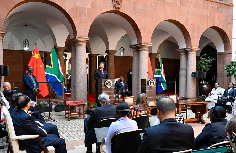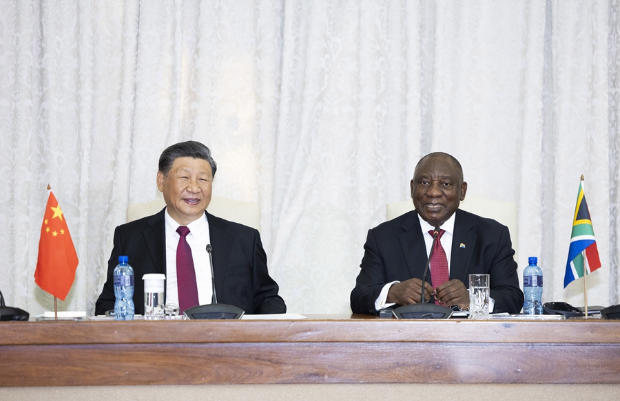 在同拉马福萨总统的会谈中,习近平主席指出,近年来,金砖国家秉持开放包容、合作共赢的金砖精神,书写了不同制度、不同文化、不同地域国家携手发展的精彩故事,成为南南合作的一面金字招牌。