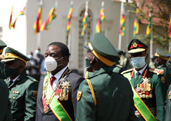 图为2021年4月18日,在津巴布韦首都哈拉雷的总统府,津巴布韦总统姆南加古瓦(左二)在津独立41周年庆祝仪式上检阅国防部队。新华社发(肖恩·朱萨摄)