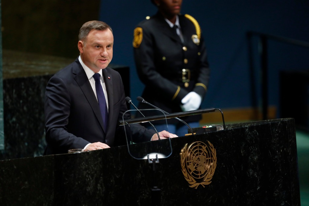 2019年9月24日,在位于纽约的联合国总部,波兰总统杜达在第74届联合国大会一般性辩论上发言。新华社记者李木子摄