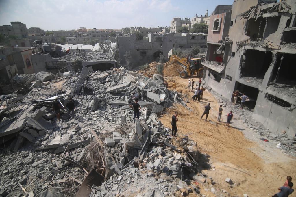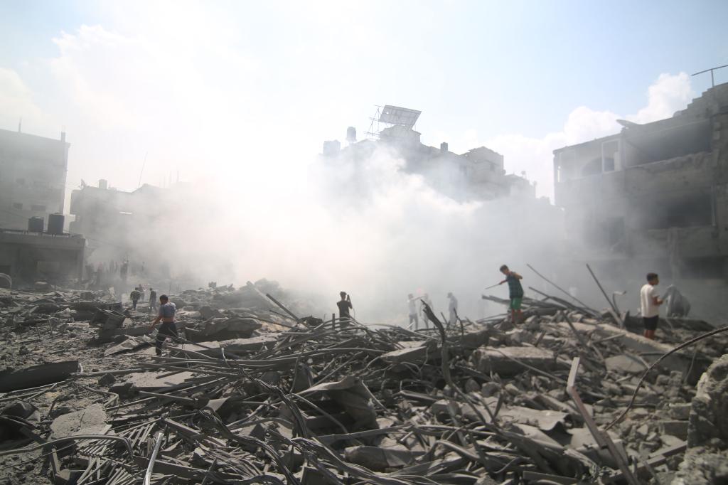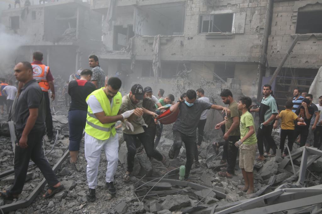 10月12日,在加沙地带南部城市拉法,人们在遭以色列空袭的受损建筑中救援伤者。新华社发(哈立德·奥马尔摄)