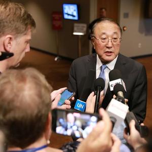 10月13日,在位于纽约的联合国总部,中国常驻联合国代表张军(中)在安理会紧急磋商后回答中外记者提问。新华社记者 谢锷 摄
