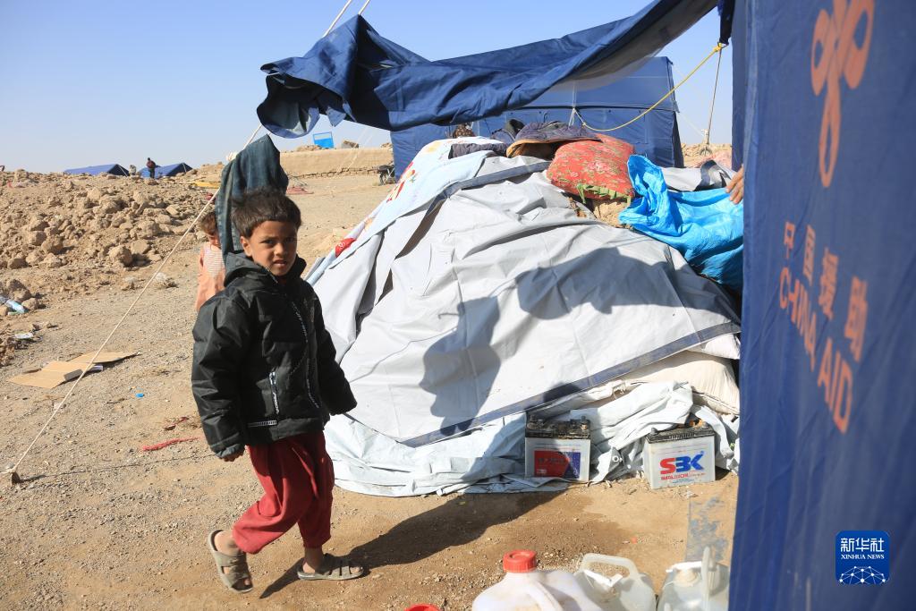 10月16日,在阿富汗西北部赫拉特省津达詹地区,儿童站在中国援助的帐篷外。新华社发(塞夫拉赫曼·萨菲摄)