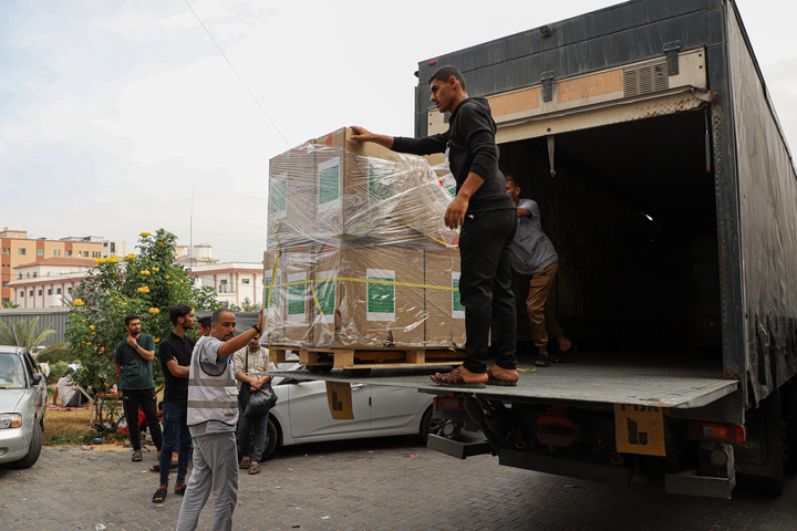 10月29日,工作人员在加沙地带南部城市汗尤尼斯的一家医院搬运医疗援助物资。新华社发(里泽克·阿卜杜勒贾瓦德摄)