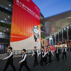 11月5日,工作人员在国家会展中心(上海)经过第六届进博会巨幅海报。新华社记者 辛梦晨 摄