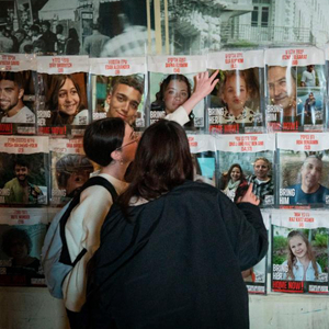11月27日,在耶路撒冷,人们查看被扣押人员海报。新华社记者陈君清摄