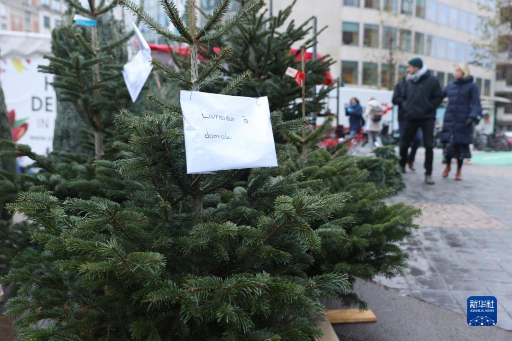 这是11月30日在比利时布鲁塞尔街头拍摄的几棵待售的圣诞树。新华社记者 赵丁喆 摄