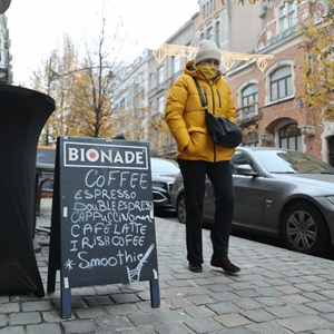 11月30日,在比利时布鲁塞尔街头,一名女子经过一家咖啡店。新华社记者 赵丁喆 摄