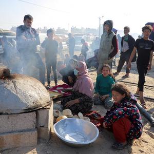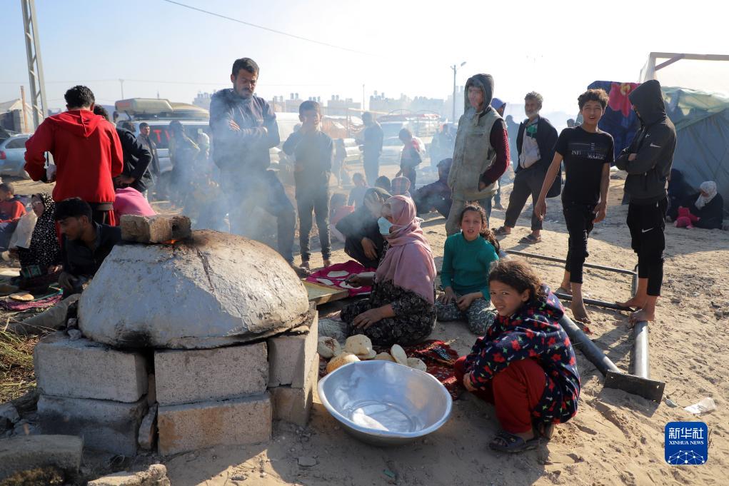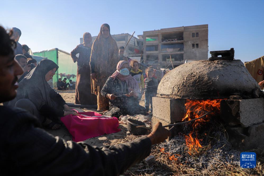 12月18日,在加沙地带南部城市拉法,人们在临时避难所准备食物。新华社发(里泽克·阿卜杜勒贾瓦德 摄)