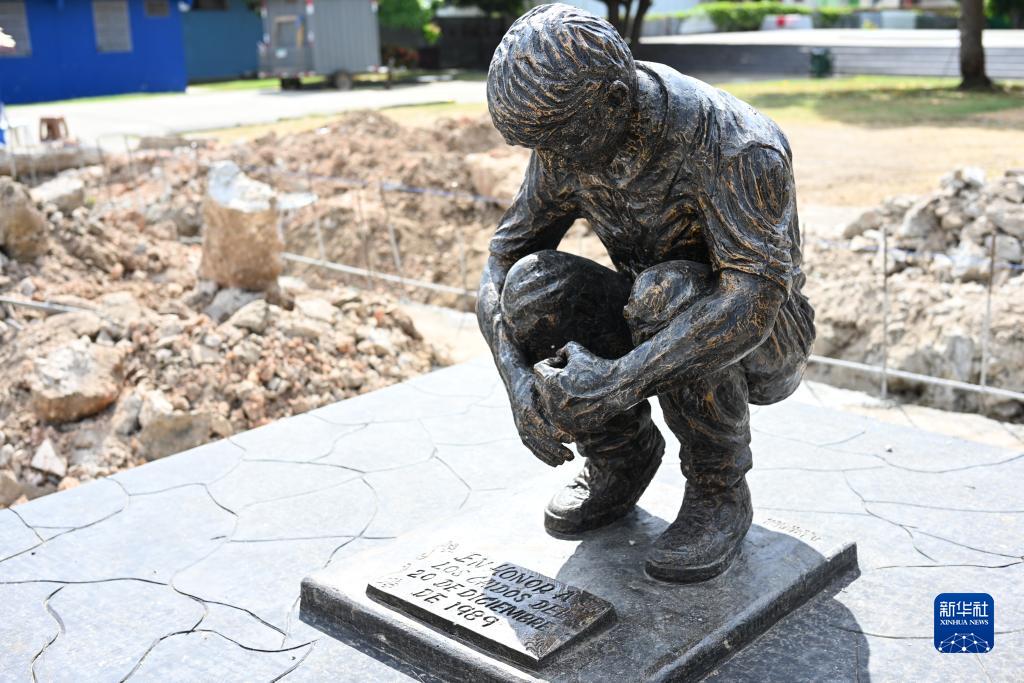 这是12月15日在巴拿马首都巴拿马城拍摄的一尊雕像,雕像前的牌子写着“纪念1989年12月20日的遇难者”。新华社记者 陈昊佺 摄