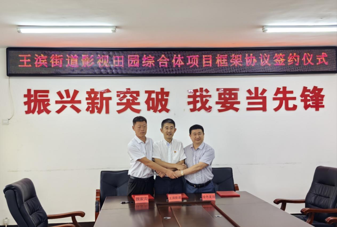 7月13日王滨街道、魏家沟社区股份经济合作社与金色麦浪(辽宁)文化发展集团有限公司签署了绿野暖阳(魏家沟村)影视田园综合体项目战略合作框架协议。