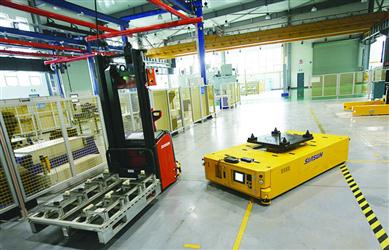 画好各种标志的车间通道上,多辆无人驾驶的物流车安静准确地驶向各自的目的地,“自己动手”去接货、送货到下一工作位。遇见岔路口,一停二看三通过。遇见工作人员,会很有礼貌地停车让行,也不跟同伴抢道。