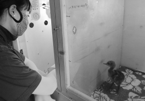 在丹顶鹤繁殖期间,繁育基地的饲养员每天清扫笼舍,巡视鹤群,判断每只鹤的健康状况,并做详细的记录,其中包括鹤的年龄、交配期、产卵时间及孵化期间的细微变化等。