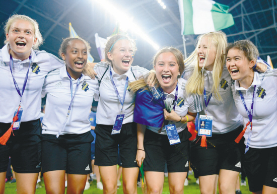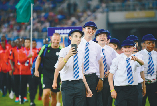 “哥德杯中国”的开幕式,更像是一个嗨爆全场的国际派对,欢快的音乐和动感的舞蹈贯穿整个开幕式。外籍舞蹈团队演绎了热情奔放的桑巴舞、夏威夷风情草裙舞等表演。运动员入场仪式也非同一般。参赛运动员都是小朋友,他们身着地方特色服装,载歌载舞进入场地,尽情释放着活泼天性。英格兰的小球员们头戴礼帽,以传统的英伦绅士风范登场;巴基斯坦球队身着民族服饰,向观众们展示特色传统舞蹈;国内的小球员们也向世界展示着中国文化的魅力,在一条15米长的“巨龙”中,来自沈阳的小球员舞动前行;来自北京的球员们手持蹴鞠,展现中国传统体育文化……