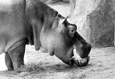 天气越来越热,不仅我们人类觉得闷热烦躁,动物们也会精神萎靡,食欲减退。7月17日,是入伏第一天,为了动物们的身体健康,沈阳森林野生动物园动物防暑降温工作开始全面启动。当日,动物园的动物配给中心对熊猫、大象、河马、犀牛、小熊猫等珍稀动物采取送西瓜、加冰块、喷水等多种措施防暑降温,确保它们可以安然度过夏天。在大象馆,记者看到饲养员定时为大象喷水,大象显出悠然自得的样子。在熊猫馆,大熊猫冰华紧紧地抱着一个大冰块不放,憨态可掬。在河马馆,小河马正在吃着大西瓜,半个西瓜一口就吞下。据了解,动物园还为动物们搭建了许多可供乘凉的遮阳篷,在饮食里面加入了夏桑菊中药颗粒,达到清热解毒防暑降温的效果。(记者/万重摄)