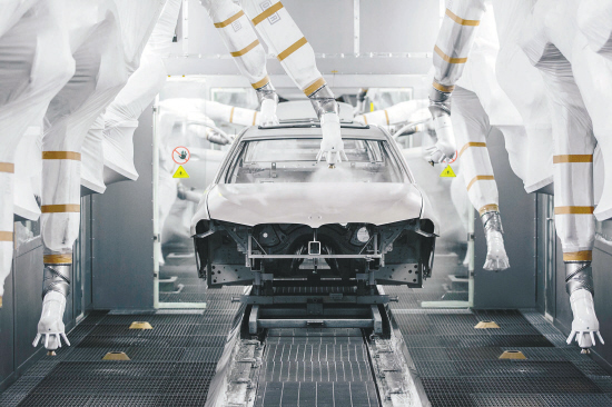 在沈阳华晨宝马汽车有限公司大东工厂涂装车间,涂装机器人为车身进行喷涂。本组图片均据新华社