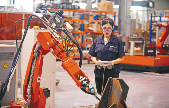 沈阳新松机器人自动化股份有限公司工作人员对机器手臂进行调试。