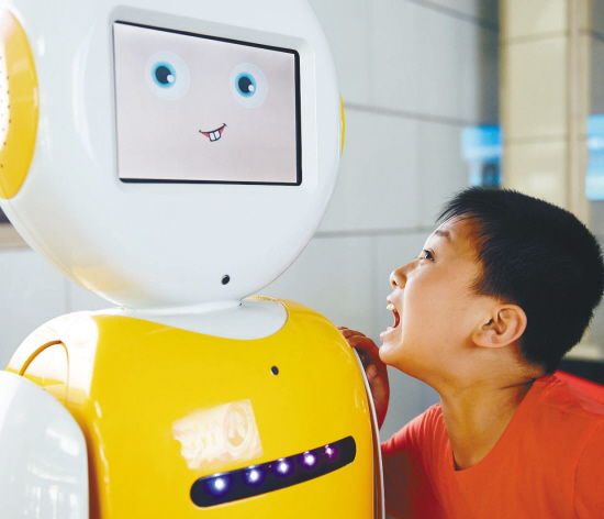 一名小朋友和沈阳新松机器人自动化股份有限公司生产的“松果”服务机器人对话。