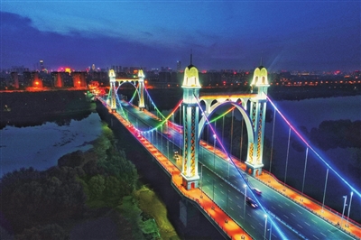 沈阳东塔跨浑河桥竣工通车已有一个多月,近期,桥梁亮化工程即将完工。夜幕降临,桥上双塔和悬索被彩灯点亮,为浑河再添一景。