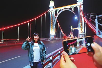 附近居民郭女士和家人赶在东塔桥亮灯时刻拍照留念。