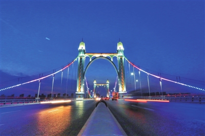 东塔跨浑河桥整体建筑风格为欧式经典双桥塔钢结构悬索桥梁,点亮后将成为沈阳新地标。