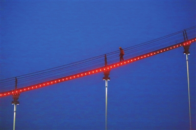 市建委城市建设处工作人员刘杨介绍,东塔桥亮化工程采用LED灯具与高压气体放电灯相结合的方式,悬索部位采用了节能高效的LED全彩5W点光源,通过逐点控制的方式,更加节能高效。