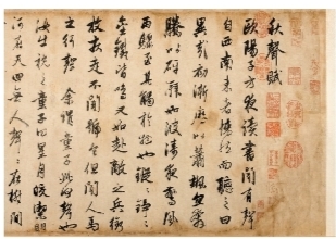 此卷行书宋欧阳修《秋声赋》,行间茂密,气韵相通,深得二王笔意,虽无明确的书写年款,但经与《吴兴赋》等对比,在运笔、结体等方面有诸多相似之处,故推测应为作者50岁后所书。《秋声赋》全篇借景抒情,词意并茂,兼赵孟頫之流畅洒落的书写,可谓相得益彰,令人回味无穷。