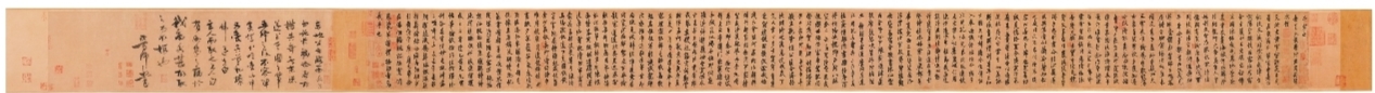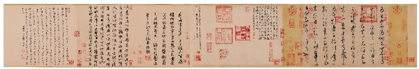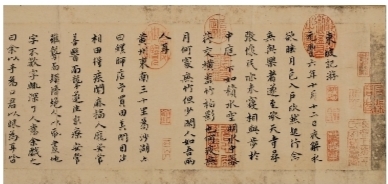 此卷由两部分组成,第一部分是《覆允夫纠掾书》手札,也称《七月六日帖》,是朱熹在67岁时写给表弟程洵的一封信,信中提及自己有眼疾,看文字辛苦。第二部分是朱熹《大学或问诚意章》手稿,据记载朱熹在临死前仍在改定其《大学或问》的注释,可见这份手稿是大儒生命尽头焕发的最后火光。此卷原还有朱熹《独有宝应寺诗》,但被拆下,至今下落不明。全卷运笔迅疾,前后呼应,转折自如,行笔中稍敛笔锋,掺以隶意。卷前有佚名绘肖像,卷后有元朱公迁、明文徵明等十一人题跋,遍述流传经历。