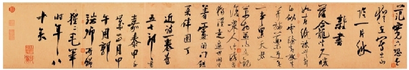 陆游(1125—1210年),曾官至枢密院编修、知夔严二州、宝章阁待制等。以诗著称,一生作诗近万首。亦擅书法,草书学张旭,行书学杨凝式,笔姿瘦硬清新,风格独具。此卷行书自书诗《记东村父老言》等八首,均刊入《剑南诗稿》卷五十五。书法笔法老到,行笔流畅,既无刻意求工,又不故作姿态。书于嘉泰四年(1204年)一月三十日,作者时年80岁,由其自题亦可知所用笔为“猩猩毛笔”。此卷前有程南云“放翁遗墨”篆书引首,后有元郭畀、俞庸等5家题跋,是传世陆游墨迹中最有代表性的作品。