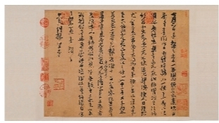 央视《国家宝藏》第一季的27件国宝中,《万岁通天帖》作为唯一的书法作品入驻“国家宝藏特展”。此帖勾摹精妙,有“下真迹一等”之誉,是研究王羲之及东晋至南朝书法最可靠的依据之一。启功曾在《唐摹万岁通天帖考》中说:“《万岁通天帖》不但没有误摹之笔,即原迹纸边破损处,也都钩出,这在《初月帖》中最为明显,如此忠实,更增加了我们对这个摹本的信赖之心。”古代书画作品依托于纸绢,尤为脆弱,此作流传过程中已遭火劫,观众仍可见火烧痕迹。