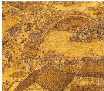 此后,街路与河道并行,岸上的街路旁商铺一家挨着一家,路上行人不绝,将人们的视线引向入城前途经的第二座桥。这时,场面一下子热闹起来。在人群的簇拥下,画面中央反而出现一个大大的空场,有几个赤膊男子在那里舞枪弄棒,仔细看那些维持秩序者的紧张表情和人们占据各种有利地形凝神观看的样子,仿佛可以听到不绝于耳的叫好声。这一场景也是整幅画卷中人物最为密集的部分。