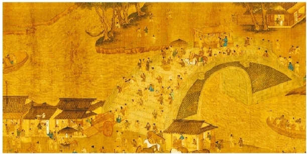 画卷中,经港口后便出现桃花掩映的人家和入城前途经的第一座石拱桥,人们或骑马,或步行,或担担,或提篮,还有沿路的各类店铺,渐渐呈现出古代街市的样貌。