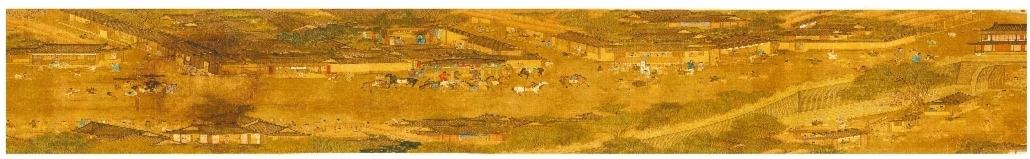 此后,画卷转过城门,细致地描绘了城中官员府邸,骑马而行的士人,街中打闹的顽童,木材、布匹等商铺和各色人家,画卷的结尾部分还勾画出了一处宫廷建筑,并描画了盛装宫人的闲居场景。