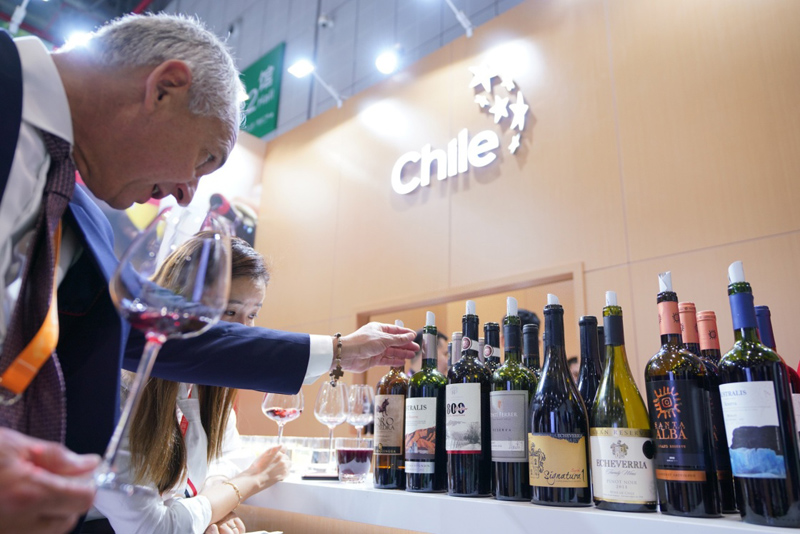 2018年11月5日,在中国上海,一名男子在首届中国国际进口博览会上了解智利红酒。新华社记者孟鼎博摄
