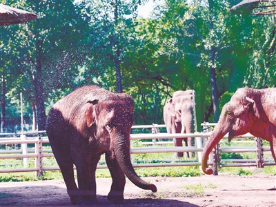 大夏天,出了一身汗,冲个澡最舒服不过了,动物园也为动物们提供了洗澡的场所。鸟馆每一个室外运动场都有花洒,可以有效降低场馆温度;豹馆和熊坳室外运动场建有瀑布和小桥,供它们戏水降温;饲养员在白犀牛室外运动场挖了两个大泥坑,供它们“洗泥浴”,降低皮肤表面温度,还能有效预防蚊虫叮咬。