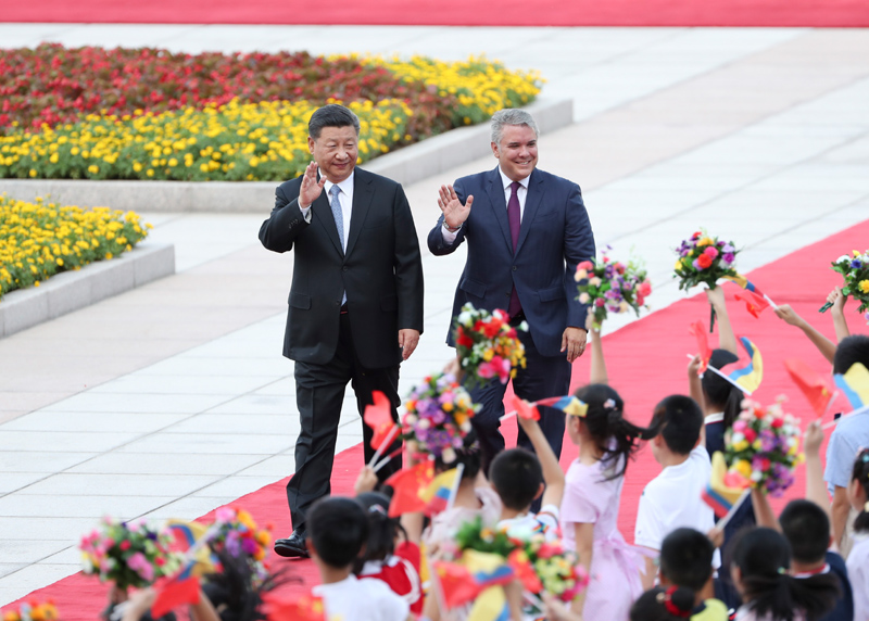 7月31日,国家主席习近平在北京人民大会堂同哥伦比亚总统杜克举行会谈。这是会谈前,习近平在人民大会堂东门外广场为杜克举行欢迎仪式。新华社记者丁海涛摄