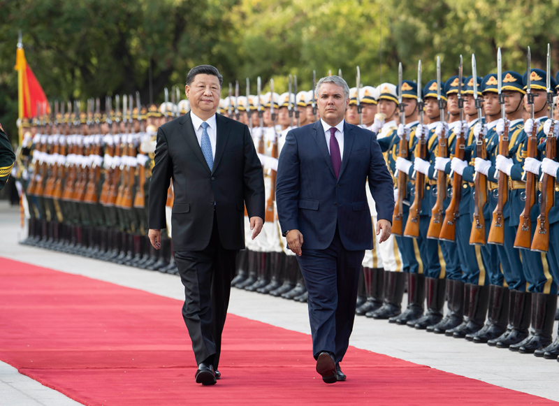 7月31日,国家主席习近平在北京人民大会堂同哥伦比亚总统杜克举行会谈。这是会谈前,习近平在人民大会堂东门外广场为杜克举行欢迎仪式。新华社记者李涛摄