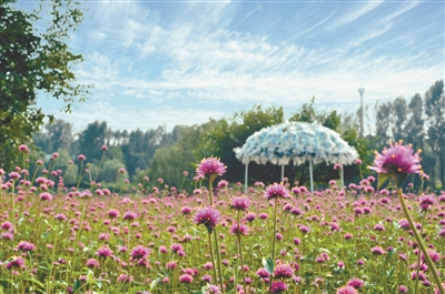 目前,千日红花和蓝色系花都已经在世博园内绽放,红蓝交错,煞是好看。