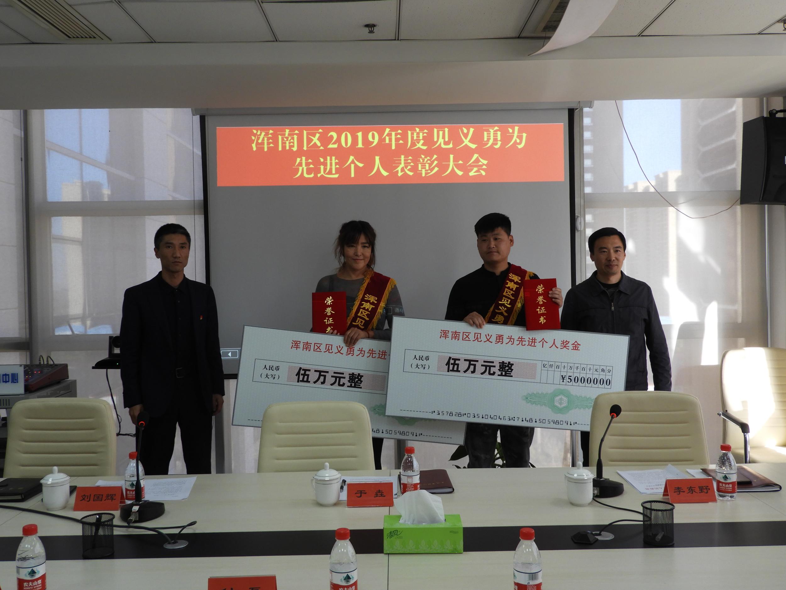 表彰大会上,浑南区政府办公室副主任李东野宣读了浑南区人民政府表彰决定,与会领导共同为闻威、付磊两名见义勇为先进个人颁发了荣誉证书并各奖励伍万元奖金。为确保见义勇为人员拥有健康身体,没有后顾之忧,浑南区每年为所有见义勇为人员进行体检,并办理了意外伤害和重大疾病保险。