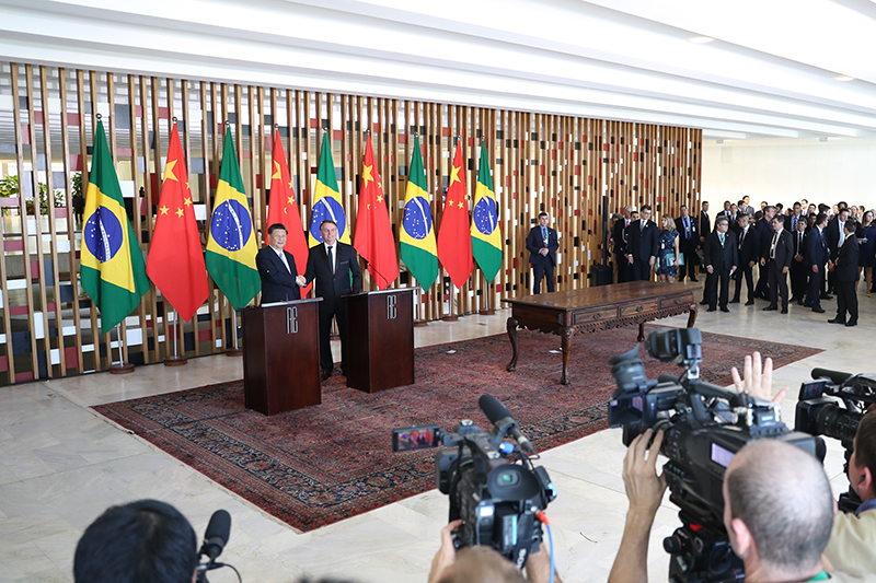 新华社巴西利亚11月13日 电 ( 记者 陈威华 赵焱 陆佳飞 ) 当地时间11月13日,国家主席习近平在巴西利亚同巴西总统博索纳罗会谈。