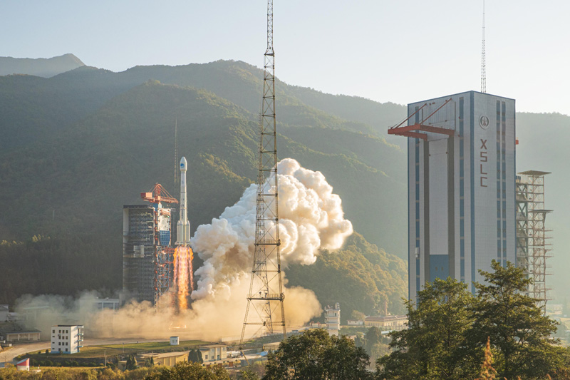 2019年11月23日8时55分,我国在西昌卫星发射中心用长征三号乙运载火箭(及配套远征一号上面级),以“一箭双星”方式成功发射第50、51颗北斗导航卫星。新华社发(郭文彬 摄)