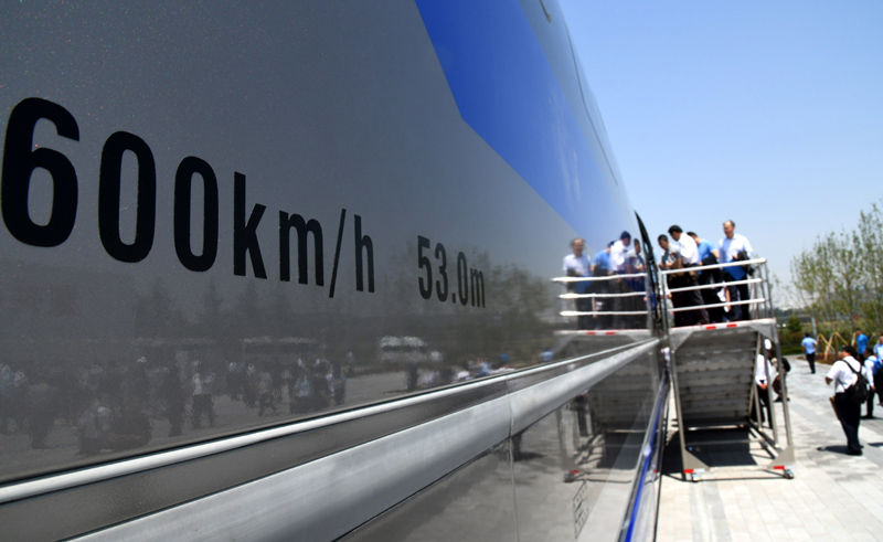 2019年5月23日,参观人员在山东青岛登上时速600公里高速磁浮试验样车参观。新华社记者 李紫恒 摄