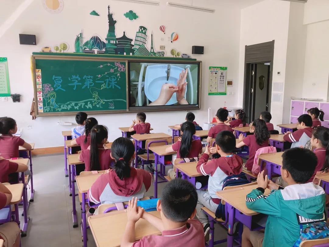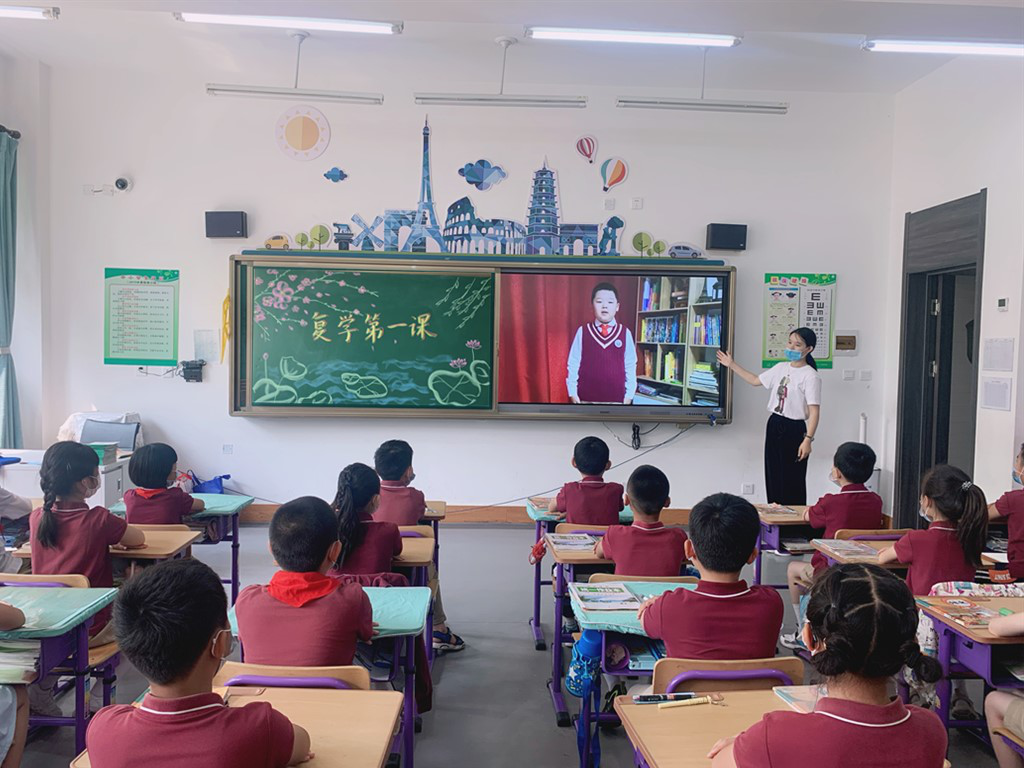 孩子们迎来了特殊的开学第一课。学校为同学们精心准备了《心怀感恩 争做先锋》主题复学第一课短片,学生代表在视频中介绍了自己假期的收获和对即将开学的期待,领导和老师们在视频中为学生送上开学的祝福。之后班主任老师耐心讲解防疫知识,落实每一项在校防疫细则。这个夏天的开学第一课注定令人难忘,这堂来之不易的第一课,也一定意义非凡。
